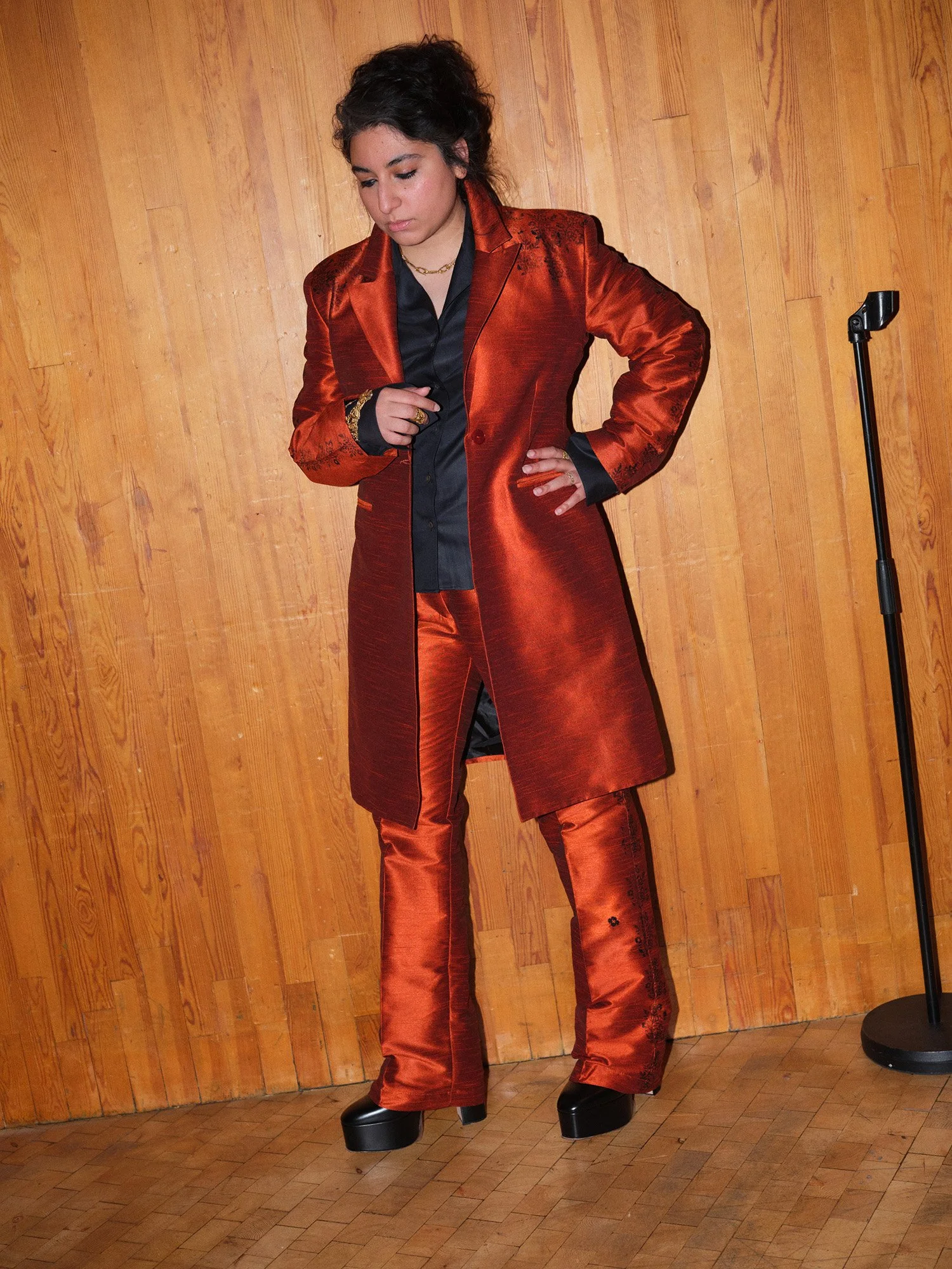 Luckily, Aftab was more than understanding. In fact, Nöl’s Palestinian identity largely inspired her decision to collaborate with Mjalli. Mjalli settled on a rusted auburn angled blazer and matching block printed pants to custom make for Aftab’s performance at Barbican. Designed by Mjalli and styled by Anna May Sweasey, Aftab’s stage ensemble is made purely out of raw silk taffeta, an homage to the fabric used in Pakistani wedding garments and historical South Asian royalty. On the shoulders, arms and legs of the piece, Mjalli used a block-printed pattern and glittered corners of that print with the tatreez flower motif from Mjalli’s home city, Ramallah.